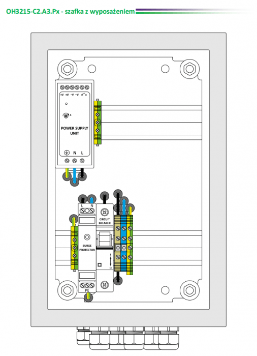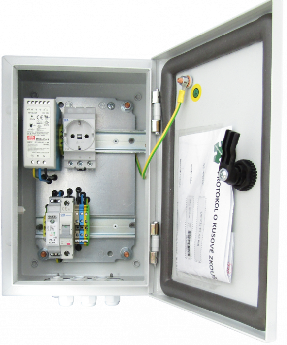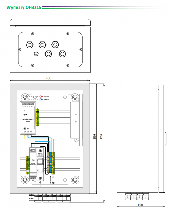 Stalowe rozdzielnice o stopniu ochrony IP66. Rozdzielnica wyposażona jest w następujące komponenty: Zasilacz 48VDC/40W, Ochronnik przeciwprzepięciowy 3. poziom, Wyłącznik automatyczny 2A, Wymiary: 300x200x150 mm, -, 230VAC