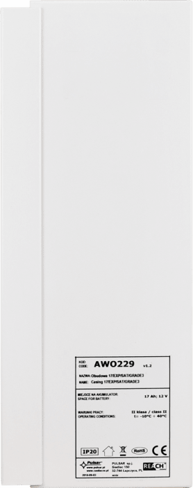PULSAR AWO229 17/EXP/SAT GRADE 3 to profesjonalna, metalowa obudowa natynkowa przeznaczona do montażu ekspanderów, modułów oraz zasilaczy buforowych systemów alarmowych SATEL i PULSAR. Przystosowana do pracy wewnątrz pomieszczeń (IP20), oferuje miejsce na akumulator do 17 Ah oraz podwójne zabezpieczenie antysabotażowe. Obudowa spełnia wymagania Grade 3 zgodnie z normą EN 50131, co czyni ją odpowiednią do instalacji o podwyższonym poziomie bezpieczeństwa.