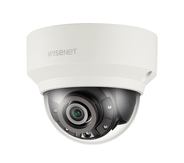 Seria X zasilana przez kopułkową kamerę wewnętrzną Wisenet 5 z siecią IR, 5 MP @30 kl./s, obiektyw stałoogniskowy 4,6 mm (77,9°), potrójny kodek H.265/H.264/MJPEG z WiseStream II, strumieniowanie wielokrotne, WDR 120 dB, True Day & Night (ICR), diody LED IR o dużej mocy z widoczną długością podczerwieni 30 m, zaawansowana analiza wideo i klasyfikacja dźwięku oraz analiza biznesowa, widok z korytarza, wykrywanie ruchu, wykrywanie mgły, HLC, przekazywanie, cyfrowa stabilizacja obrazu, dwukierunkowy dźwięk i dwa gniazda microSD/SDHC/SDXC, port USB ułatwiający instalację, IK08, PoE/12 V DC