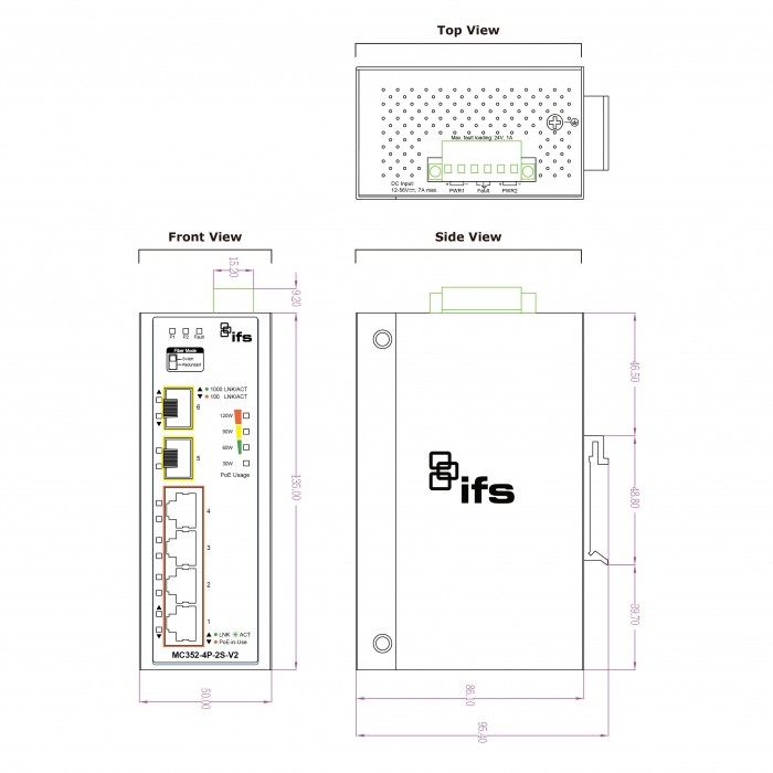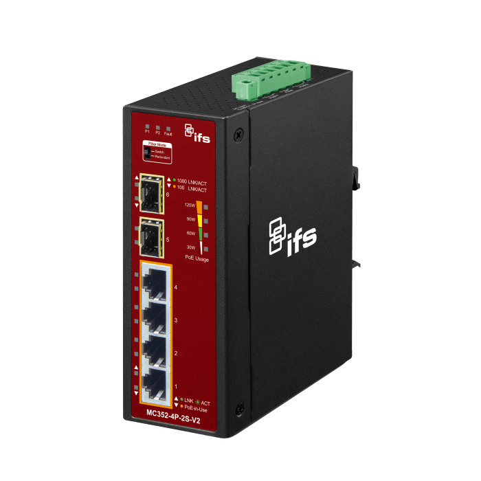 Niezarządzalny przemysłowy mediakonwerter 1G, 4-Porty 10/100/1000Base-Tx IEEE802.3at + 2-Porty SFP, PoE 4x 30W, (-40~75℃), zasilanie 48V DC, montaż DIN lub ścienny