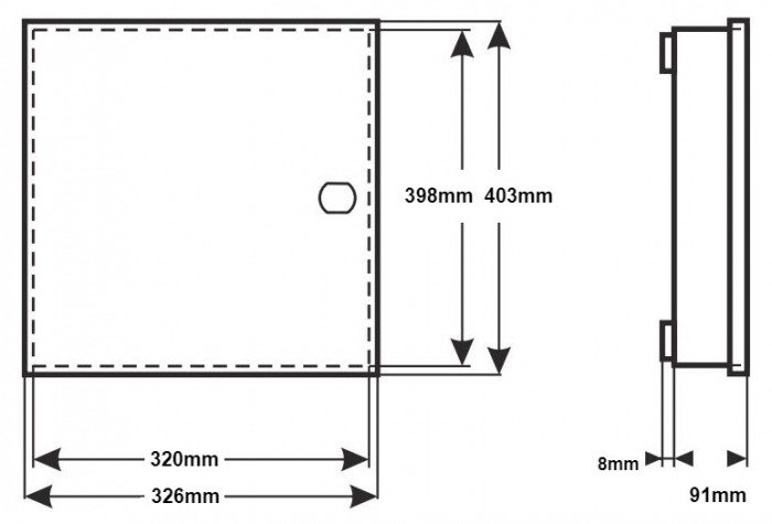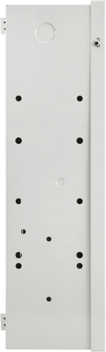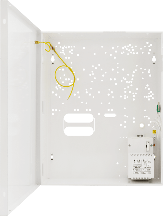 Obudowa wyposażona jest w transformator TRP 40VA (16V/18V AC), miejsce na akumulator 17Ah / 12V oraz zabezpieczenie antysabotażowe (tamper), chroniące przed nieautoryzowanym dostępem. Dystans 8 mm od ściany ułatwia prowadzenie przewodów i montaż okablowania. Produkt przeznaczony jest do montażu wewnętrznego.