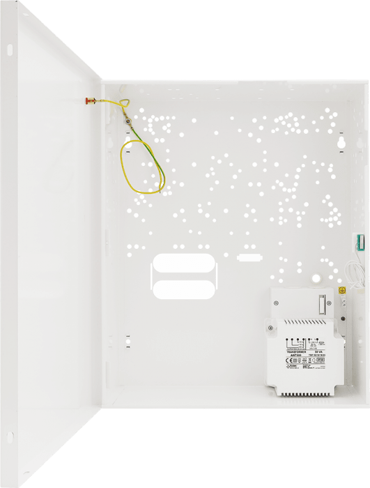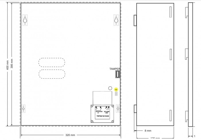 Obudowa wyposażona jest w transformator TRP 50VA (16V / 18V / 20V AC), miejsce na akumulator 7Ah lub 17Ah / 12V oraz zabezpieczenie antysabotażowe (tamper), chroniące przed nieautoryzowanym dostępem. Dystans 8 mm od ściany ułatwia prowadzenie przewodów i montaż urządzeń. Obudowa zamykana jest poprzez skręcanie, z możliwością montażu zamka.