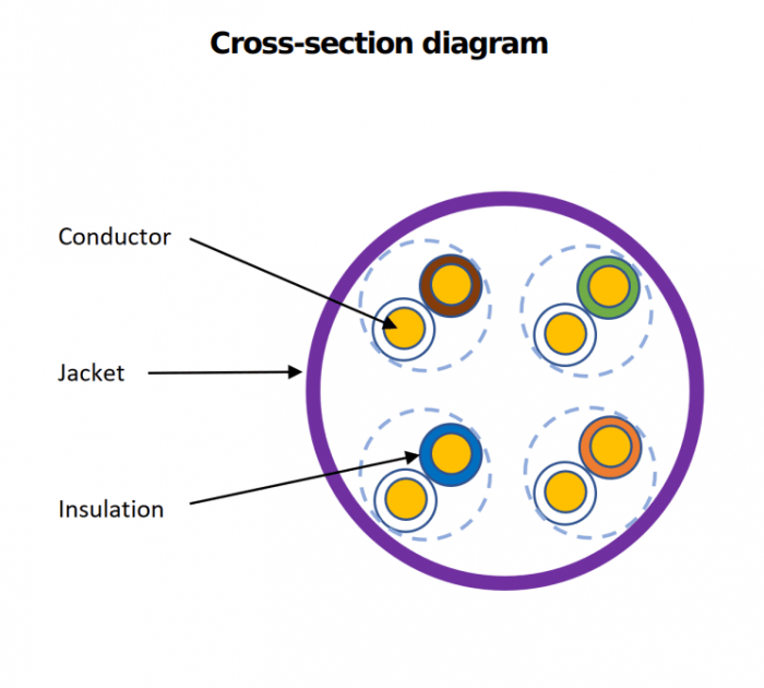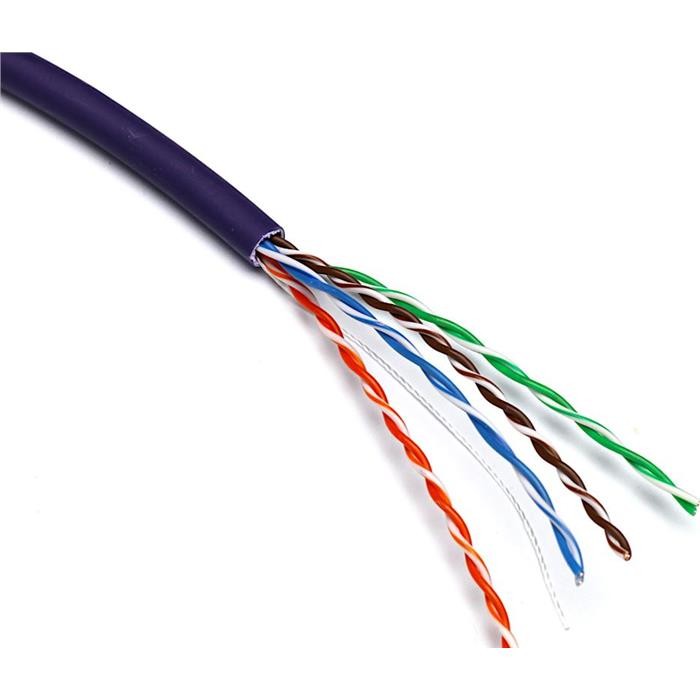Przewód instalacyjny typu skrętka komputerowa kat.5 UTP nieekranowany fioletowy, box 305m. Cztery pary AWG 24, przewodnik miedziany. Powłoka LSOH B2ca.