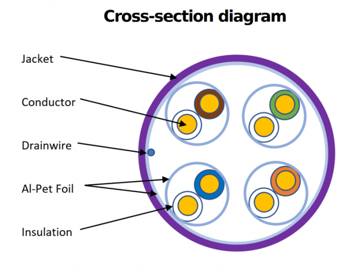 Przewód instalacyjny typu skrętka komputerowa kat.6A F/FTP ekranowany kolor "Ice Blue", rolka 500m. Cztery pary AWG 23 owinięte indywidualnie folią ekranującą - ekranowanie dla każdej pary + drut uziemiający + folia ekran. ogólna. Powłoka LSOH Dca.