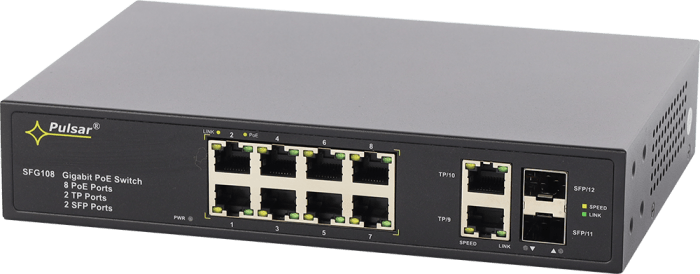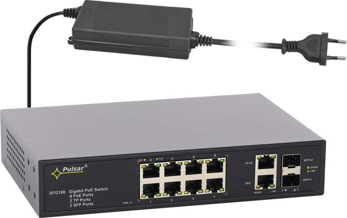 Switch PoE 12-portowy SFG108-90W do 8 kamer IP 12 portów (8xPoE + 2xUPLINK + 2xUPLINK – gniazda SFP); Zasilacz desktop 230VAC → 52VDC/1,75A/90W w zestawie; 220 x 44 x 150