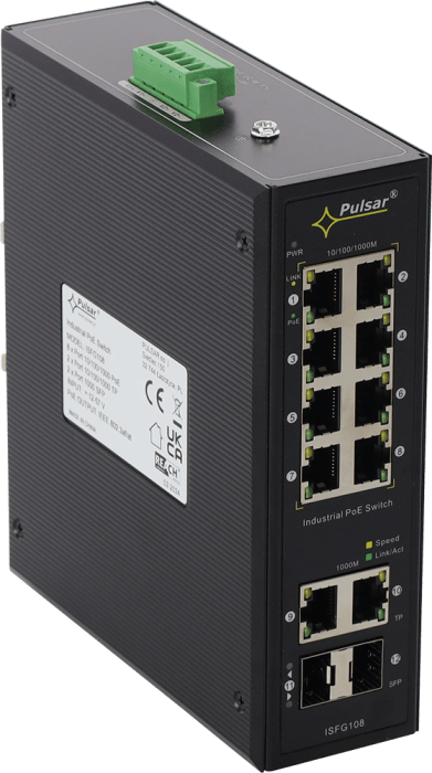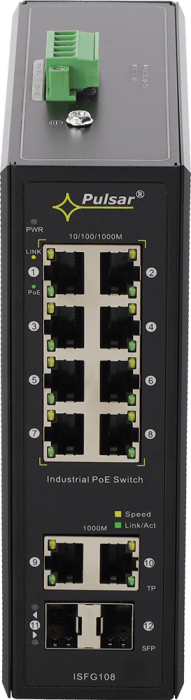 Switch przemysłowy PoE ISFG108 (8xPoE, 2xSFP, 2xRJ45) 12 portów (8xPoE + 2xUPLINK + 2xUPLINK – gniazda SFP); Zasilanie: 12-57VDC (opcja zasilania redundantnego); 54 x 176 x 153