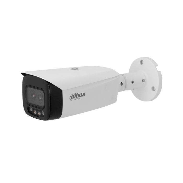 Podwójne czujniki AI z technologią obrazowania multispektralnego, które generują kolorowe obrazy w warunkach słabego oświetlenia. Maksymalna rozdzielczość: 4 MP (2688 × 1520) przy 25/30 kl./s. Wbudowana dioda LED z białym światłem/podczerwonym, o maksymalnym zasięgu oświetlenia 50 m. ROI, SMART H.264+/H.265+, AI H.264/H.265, elastyczne kodowanie, możliwość zastosowania w różnych przepustowościach i środowiskach pamięci masowej. Tryb rotacji, WDR, 3D NR, HLC, BLC, cyfrowy znak wodny, możliwość zastosowania w różnych scenach monitoringu. Inteligentny monitoring: wtargnięcie, przekroczenie bariery, szybki ruch (trzy funkcje wspierają klasyfikację i dokładne wykrywanie pojazdów i ludzi); porzucony obiekt, brakujący obiekt, wykrywanie przebywania w pobliżu, gromadzenie się ludzi i wykrywanie parkowania. Detekcja twarzy: śledzenie, migawka, optymalizacja migawki, optymalne przesyłanie migawki twarzy, poprawa jakości obrazu twarzy i ekspozycja twarzy. Liczenie osób: zarządzanie kolejkami, liczenie osób w strefie, liczenie osób wchodzących/wychodzących oraz generowanie i eksportowanie raportów (dzień/miesiąc/rok). Alarm: 1 wejście, 1 wyjście; dźwięk: 1 wejście, 1 wyjście; obsługa kart Micro SD o pojemności maks. 256 GB; wbudowany mikrofon i głośnik. Zasilanie 12 V DC/PoE. Stopień ochrony IP67.