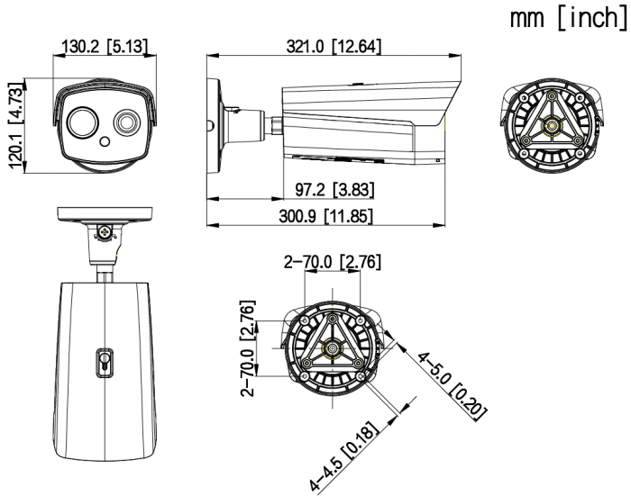 Niechłodzony detektor płaszczyzny ogniskowej z tlenkiem wanadu. Matryca CMOS z progresywnym skanowaniem 4 megapikseli (1/1,8 cala). Wykrywanie i alarm termiczny, wykrywanie przekroczenia linii, wtargnięcia, łączenie wielu reguł wyzwalania oraz filtrowanie obiektów. Szerokie napięcie wejściowe 12 V DC ± 20% i zasilanie PoE Okrągła puszka przyłączeniowa Zasięg oświetlenia do 80 m. Klasa szczelności IP67.
