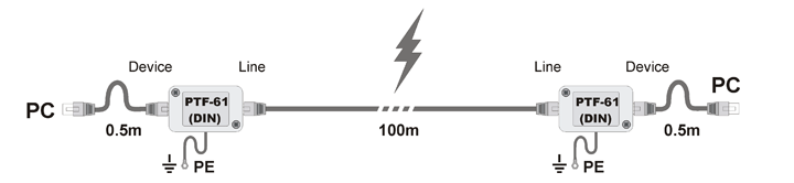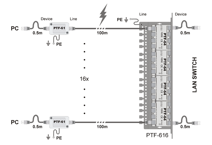 PTF-61-EXT/PoE to wysokiej klasy, jednoprzewodowy ogranicznik przepięć przeznaczony do ochrony sieci Gigabit Ethernet 10G. Urządzenie zapewnia skuteczne zabezpieczenie transmisji danych oraz zasilania PoE w instalacjach kategorii 6A i niższych, chroniąc sprzęt sieciowy przed skutkami wyładowań atmosferycznych i przepięć. Dzięki trójstopniowemu układowi ochronnemu opartego na technologii MOSFET, PTF-61-EXT/PoE gwarantuje najwyższą skuteczność tłumienia przepięć przy zachowaniu pełnej kompatybilności ze wszystkimi standardami PoE, w tym Hi PoE. Przeznaczony jest do zastosowań wewnętrznych i zewnętrznych, m.in. do ochrony kamer IP, sterowników PLC, urządzeń IoT oraz punktów dostępowych.